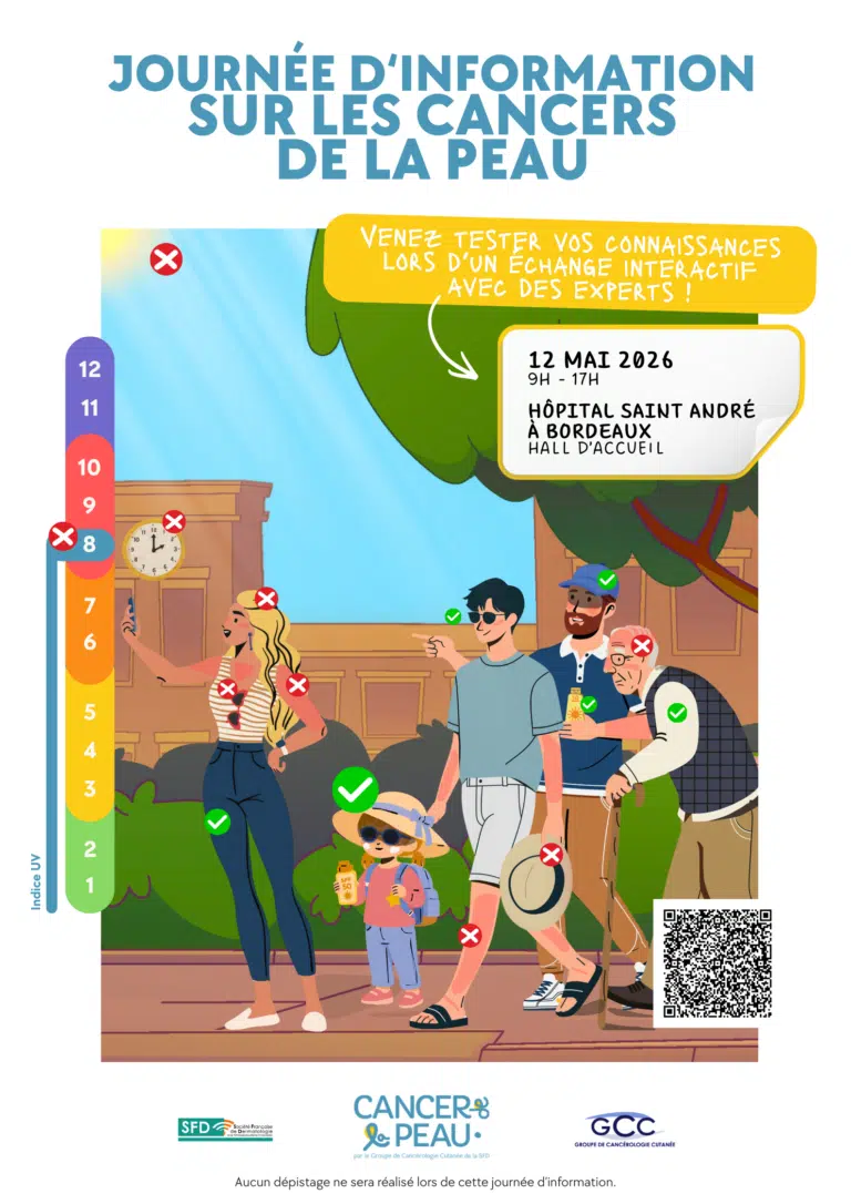 12 mai 2026 | Toute la journée | BordeauxLe CHU de Bordeaux, en partenariat avec le Groupe de cancérologie cutanée (GCC), organise une journée d’information sur les cancers de la peau à destination du grand public, mardi 12 mai 2026 à l’hôpital Saint-André.