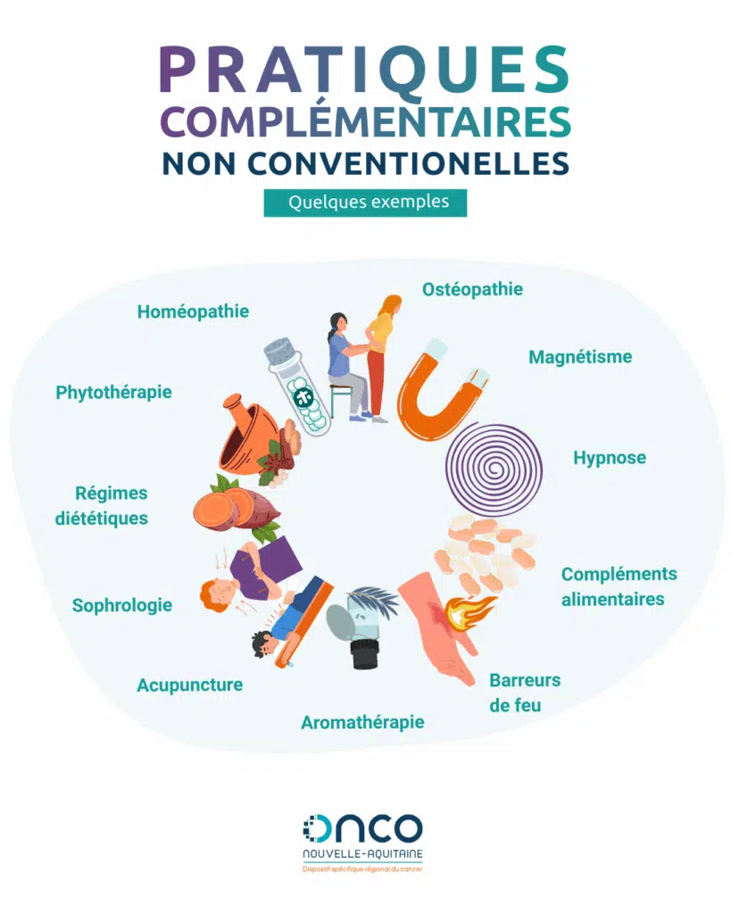 En cancérologie, les pratiques non conventionnelles ne peuvent se concevoir que de manière complémentaire au traitement spécifique du cancer lui-même (chirurgie, radiothérapie, chimiothérapie etc.).